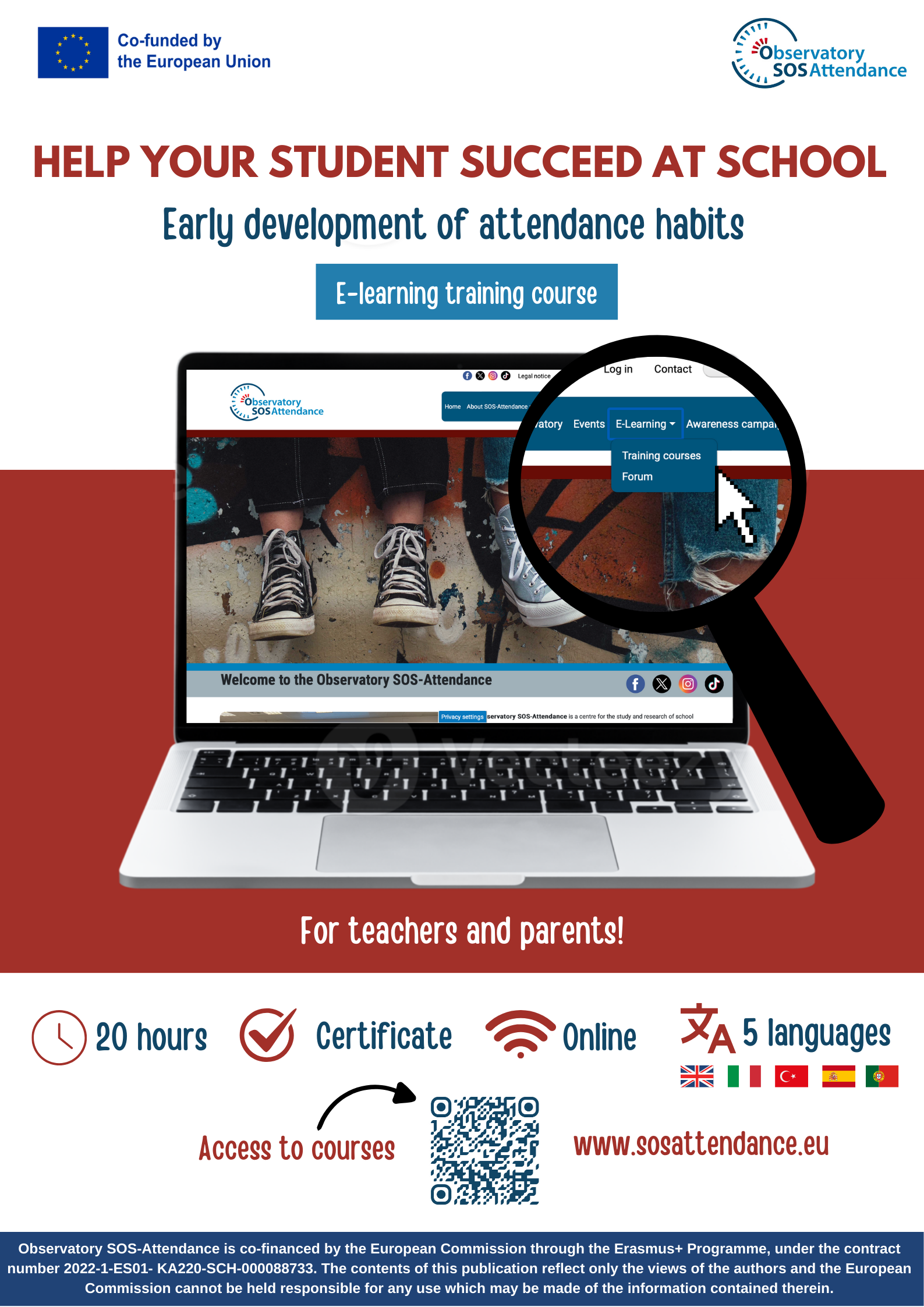 Observatory SOS-Attendance is co-financed by the European Commission through the Erasmus+ Programme, under the contract number 2022-1-ES01- KA220-SCH-000088733. The contents of this E-learning training course reflect only the views of the authors, and the European Commission cannot be held responsible for any use which may be made of the information contained therein. |