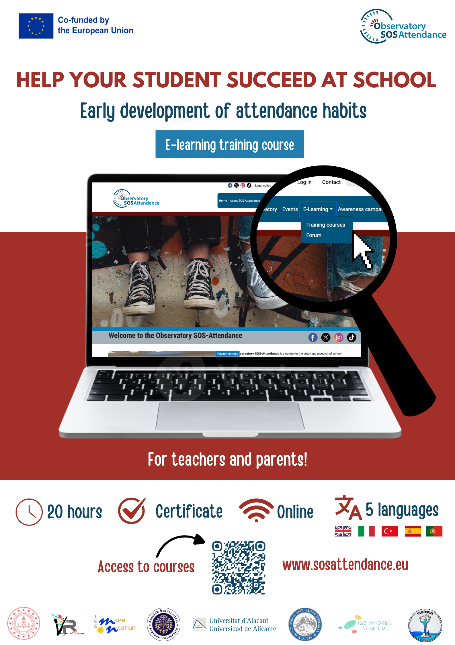 In this section you can find e-learning courses for teachers and parents designed based on the needs identified by this project. In addition, virtual cooperation is promoted through a forum in which people are able to exchange experiences, opinions and discuss how social changes and political actions affect school attendance.