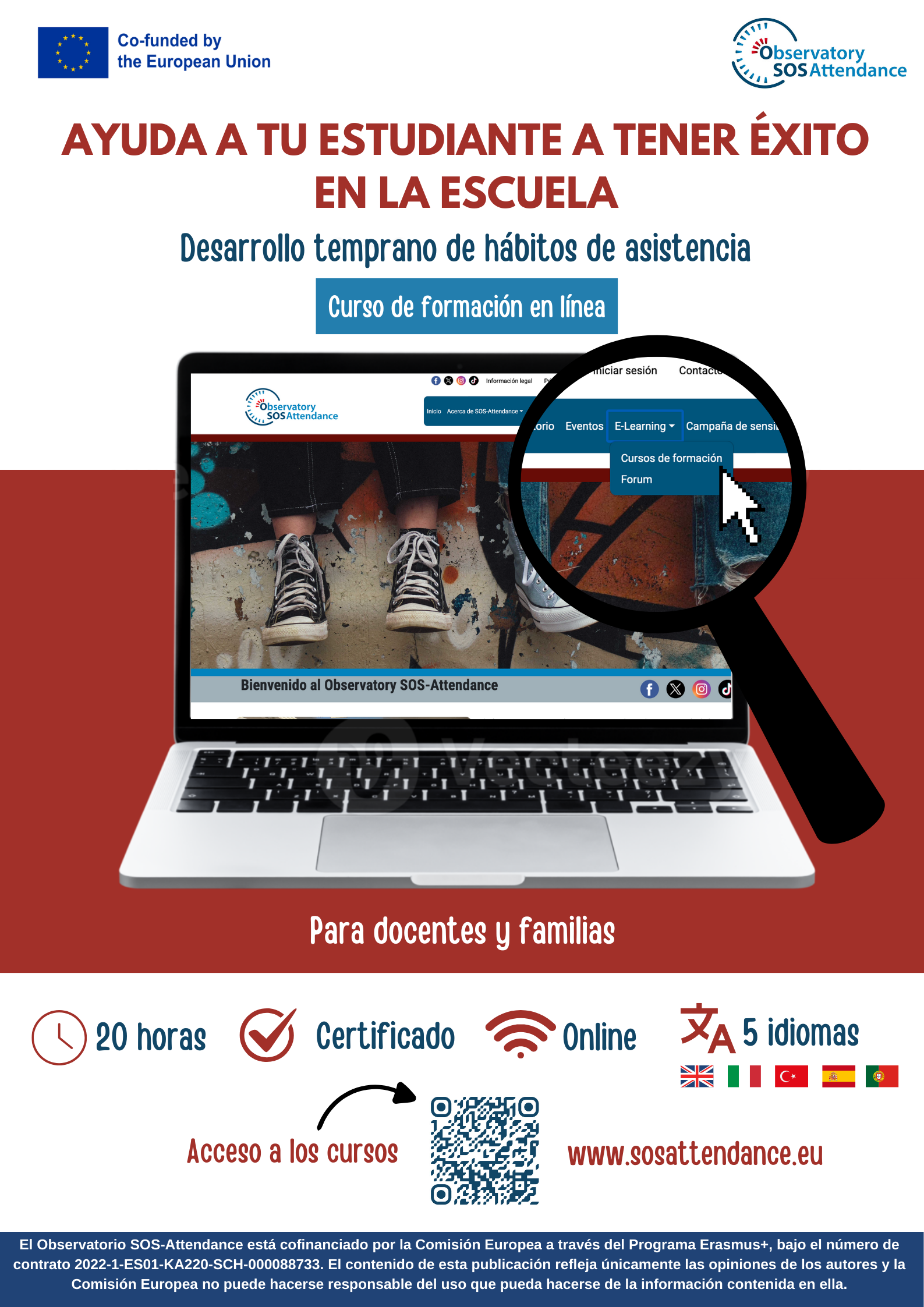 El Observatorio SOS-Attendance está cofinanciado por la Comisión Europea a través del Programa Erasmus+, bajo el número de contrato 2022-1-ES01-KA220-SCH-000088733. El contenido de este curso de formación en línea refleja únicamente las opiniones de los autores, y la Comisión Europea no puede responsabilizarse del uso que pueda hacerse de la información contenida en él. |