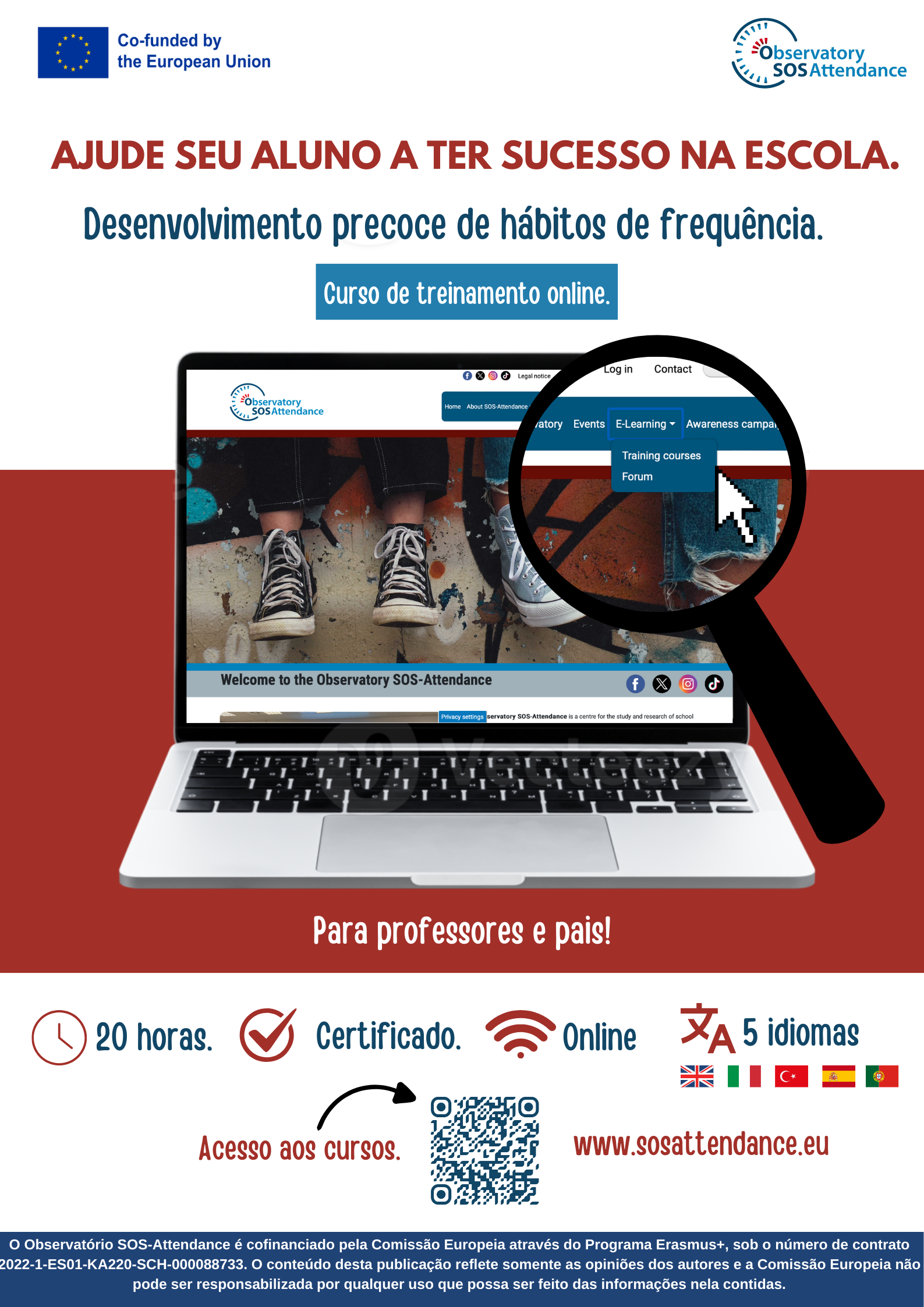 O Observatório SOS-Attendance é cofinanciado pela Comissão Europeia através do Programa Erasmus+, sob o número de contrato 2022-1-ES01-KA220-SCH-000088733. O conteúdo deste curso de formação online reflete apenas as opiniões dos autores, e a Comissão Europeia não pode ser responsabilizada por qualquer uso que possa ser feito das informações aqui contidas. |